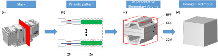 Stress modelling from land/channel to full PEMFC stack using homogenization method